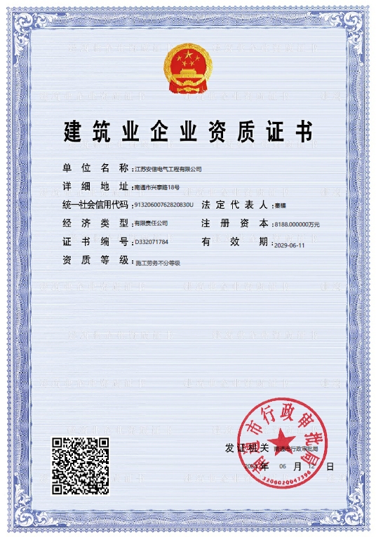 在創業之初,公司就堅持高起點的戰略思路,廣納賢才,集聚行業精英,創新發展,做優企業品牌。現已取得:承裝二級、承修二級、承試二級,電力工程施工總承包二級,輸變電工程專業承包二級,建筑工程施工總承包二級,建筑機電安裝專業承包二級,地基基礎專業承包二級資質證書,并通過了質量、環境、職業健康和安全管理體系認證,確保各項工作有序管控。